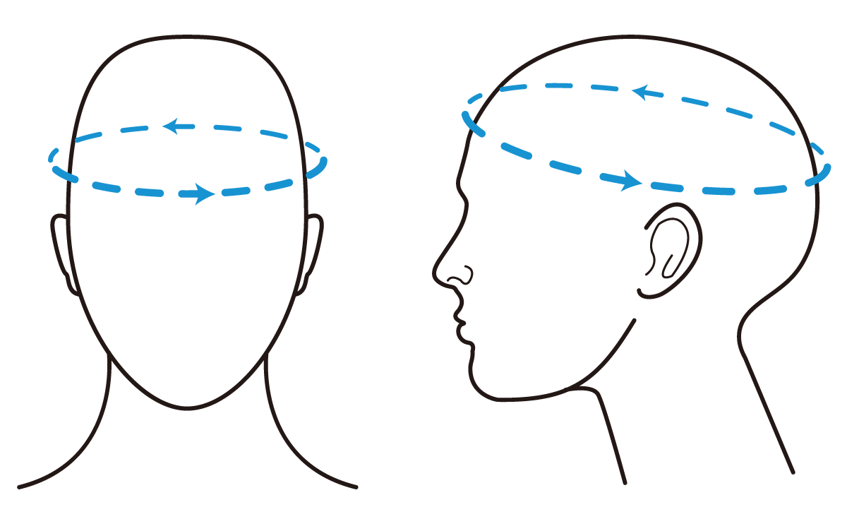 頭囲の計測方法は簡単です。眉毛のすぐ上にメジャーをあてて後頭部の最も突出している部分を経由して1周します。計測した長さ(cm)をもとにサイズを決定してください。