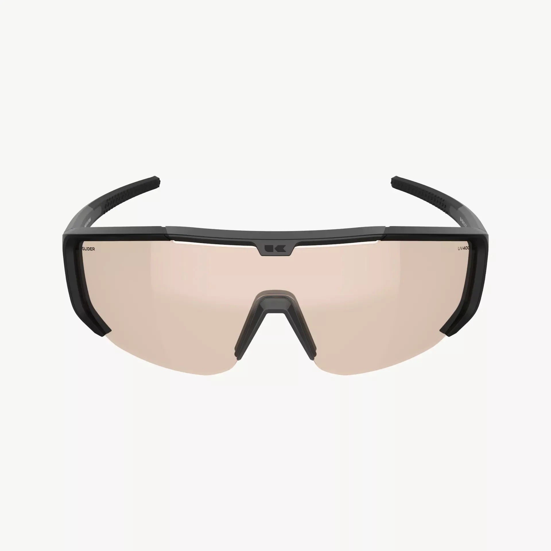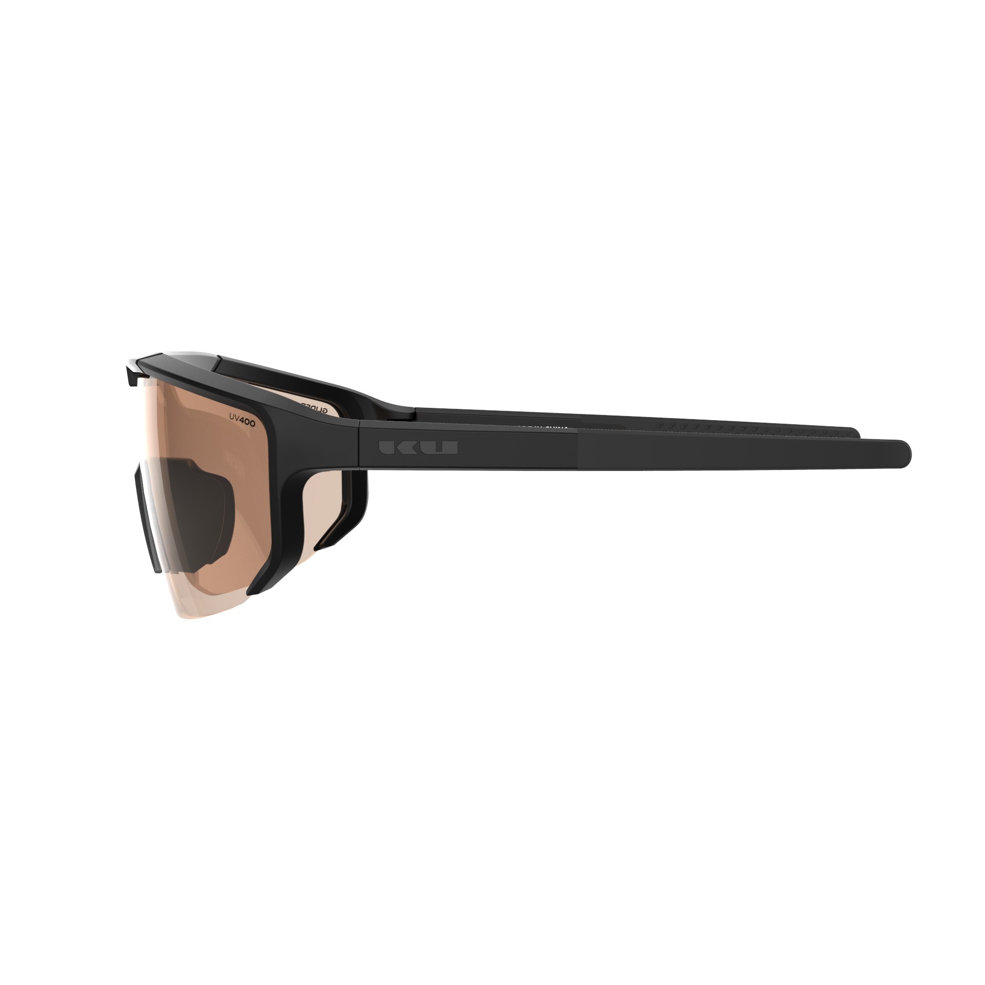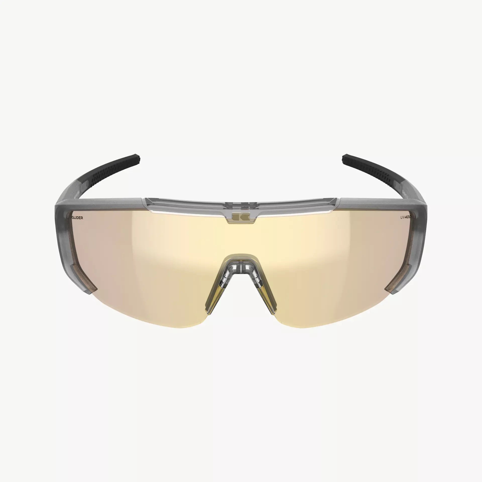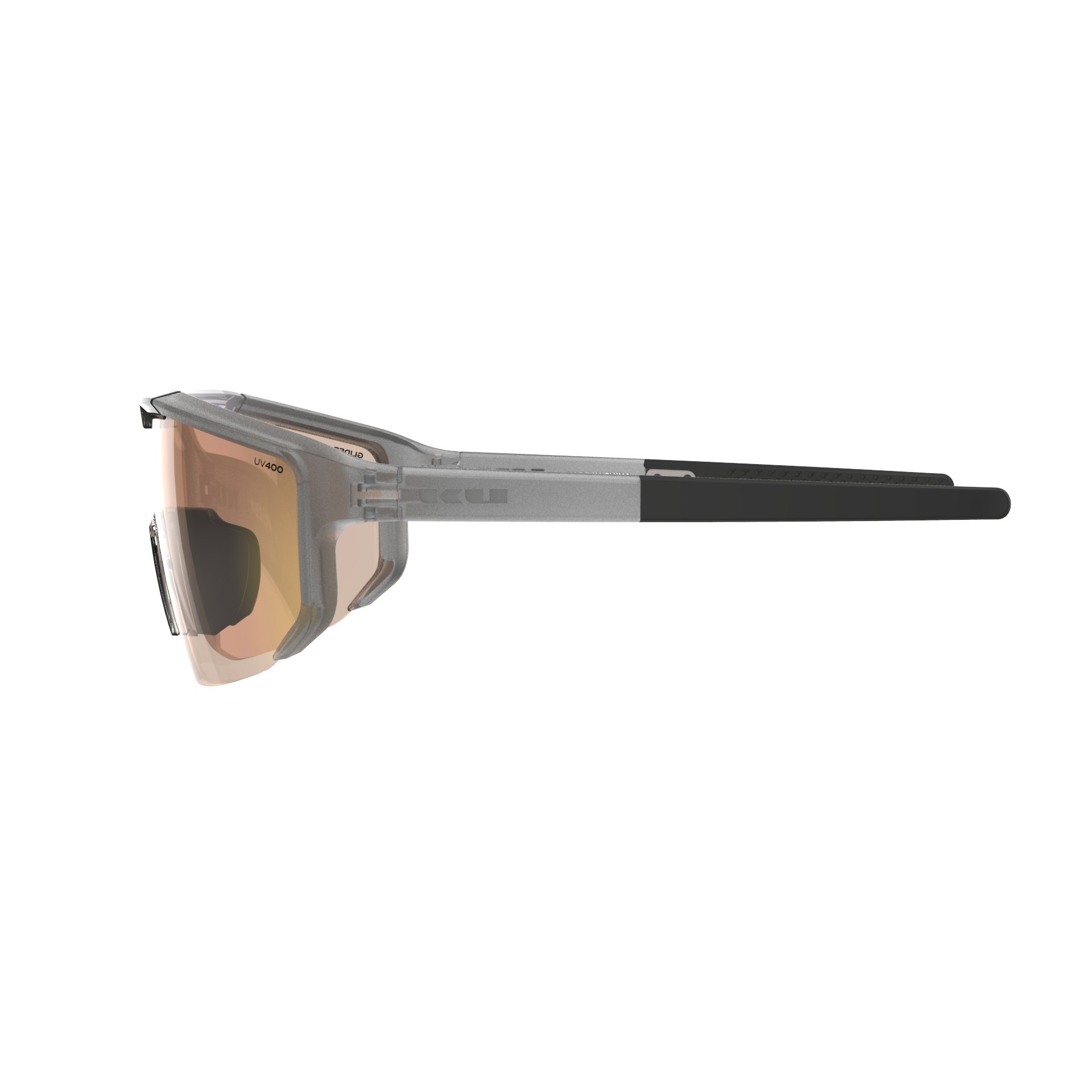 調光機能付きの高性能レンズを搭載したGLIDERの最大の特徴は、クリアレンズではなく、あらかじめ色付きのレンズを採用している点です。紫外線量に応じてCAT2からCAT3まで自然に色の濃さが変化し、どんな光環境下でも最適な視界を提供します。さらにUV400プロテクションによって99%以上の紫外線をカットし、目をしっかりと保護します。